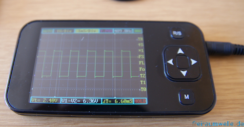 Die Bedienung ist recht intuitiv. Mit dem Curser geht es halt hoch und runter oder nach rechts oder links. Im Vergleich mit einem „normalen“ Oszilloskop benötigt man aber schon mal ein paar Bedienschritte mehr bis das Signal vernünfig dargestellt wird.