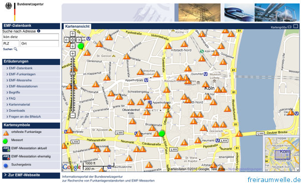 Die Bundesnetzargentur stellt unter http://emf2.bundesnetzagentur.de/karte.html eine Übersicht über alle Standorte von standortbescheinigungspflichtigen Funkanlagen bereit.