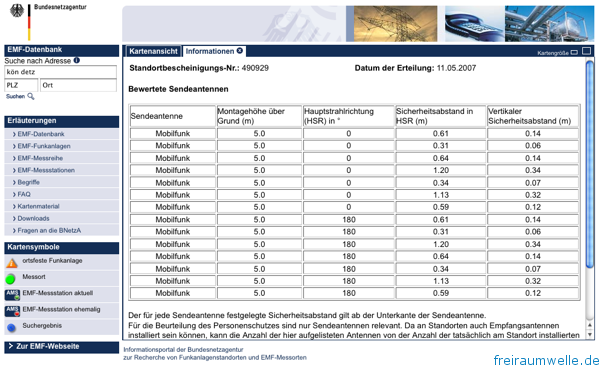 Die dargestellten „I’s“ symbolisieren alle eine Funkanlage. Nach dem anklicken einer Funkanlage öffnet ein weiteres Fenster mit einer detaillierten Liste zur Verwendung, Montagehöhe, Sicherheitsabstand, etc.