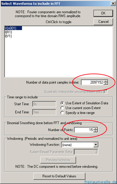 Es empfiehlt sich zudem, bei einer sehr genauen Simulation die Anzahl der Punkte (data point samples) in den Optionen der FFT zu erhöhen.