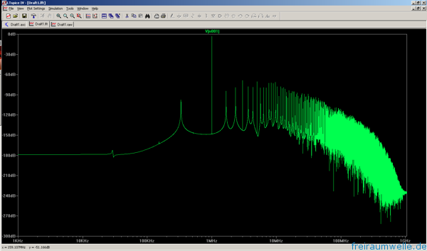 In LTspice können die Ergebnisse der Simulation statt im Zeitbereich über die Schnelle Fourier Transformation (FFT) auch im Frequenzbereich betrachtet werden. Dabei fällt auf, dass selbst einfache Sinussignale im Frequenzbereich Oberwellen aufweisen.